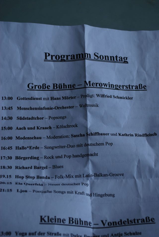 Gestern bin ich durch die Merowingerstraße gewandelt, vorbei an duftenden Köstlichkeiten und war berührt von dem unprätentiösen Charme dieser Veranstaltung, dem nach dem Murphys Gesetz auch ein bisschen Regen nichts anhaben kann. z.B. spielten halt dann Akteure des Theater Kellers, unter dem Zelt, an der Comedia und auch an die Zuschauer hatte man gedacht .