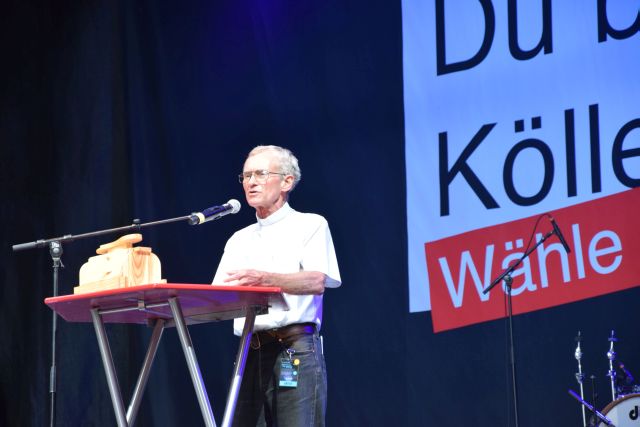 Pfarrer Meurer erzählte Geschichten aus dem Leben und davon was es bedeutet arm zu sein und keine Wohnung zu finden und hatte für Hermann Rheindorf falls er es mal nötig hat, einen Schuhputzkasten mitgebracht.