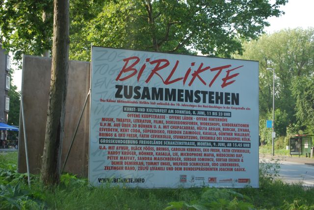 Eigentlich wollte ich einen Beitrag über die Veranstaltungen am Wochenende schreiben, aber da bekam ich ein Problem, das sie einerseits so unterschiedlich sind und ein gemeinsamer Beitrag, andererseits keinem gerecht werden würde. Ein Fest zum Gedenken an die NSU Morde zu feiern ist eine Kölsche Lösung , die, die Menschen seit Arsch Huh auffordert, zusammenzustehen und zu feiern und damit ein Zeichen zu setzen.