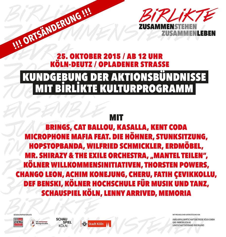 Am gleichen Tag lädt das Bündnis „BIRLIKTE“ zum Kulturfest im Eigelstein und am Hansaring ein, um dort mit den Kölner Künstlern auf zwei Bühnen und einer open stage in einem großen Programm aus Wort- und Musikbeiträgen mit der Kraft der Kultur zu demonstrieren, wofür wir alle stehen: Nicht für Engstirnigkeit, Rassismus und Gewalt, sondern für ein friedliches Zusammenleben, für Vielfalt, für Verständigung, für eine solidarische Stadtgesellschaft und für die Vertiefung des Zusammenhalts im Alltag.“ Quelle