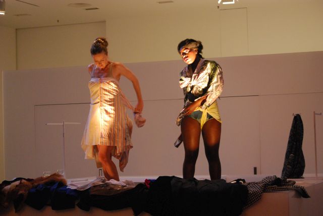 Angefangen hat die Performance, bei der u.a der regionale Designer #Changdreizehn, aus dem „House of Chang“, in Köln, aber auch spontane Statisten, Modeblogger u.u.u. mitgewirkt haben, im Foyer, in dem zwei „Chicks, aus einer Fülle von Kleidungsstücken, die, die beiden an- und ausgezogen haben, Mode in einem neuen Kontext gesetzt haben.