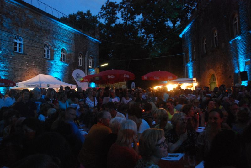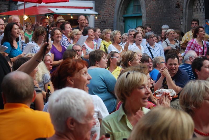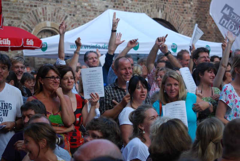 Man hat mir berichtet, dass der harte Kern, die „Fankurve“, einfach sitzen geblieben ist. Es soll auch Leute gegeben haben die trotz der Schirme so nass waren, dass sie nach Hause gegangen sind. Manche haben sich allerdings nur schnell umgezogen und sind dann wieder gekommen. Die Techniker (der?) hatten mit Stromausfällen zu kämpfen, Tische und Bänke mussten wieder trocken gelegt werden, aber das konnte keinen wirklich erschüttern. So wie er sich während des Wolkenbruchs geleert hatte, so füllte er sich wieder. Der singende Biergarten ist etwas ganz besonderes. Hier kommen Menschen unterschiedlichen Alters zusammen und haben Spaß miteinander, beim Singen .