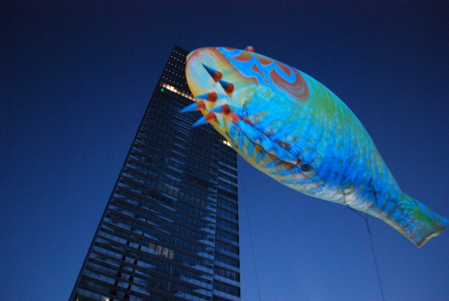 24 Künstler in Meeresbewohner-Kostümen versetzten die Zuschauer mit heliumgefülltem See-Getier in eine Unterwasserwelt und verzauberten sie . Das kostenlose Spektakel begann mit Einbruch der Dunkelheit.