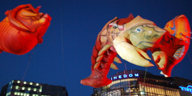 Die französische Theatergruppe Plasticiens Volants führte heute im Mediapark ihre Show „Perle“auf und das war mit der Musik und live natürlich viel schöner als auf dem Video.