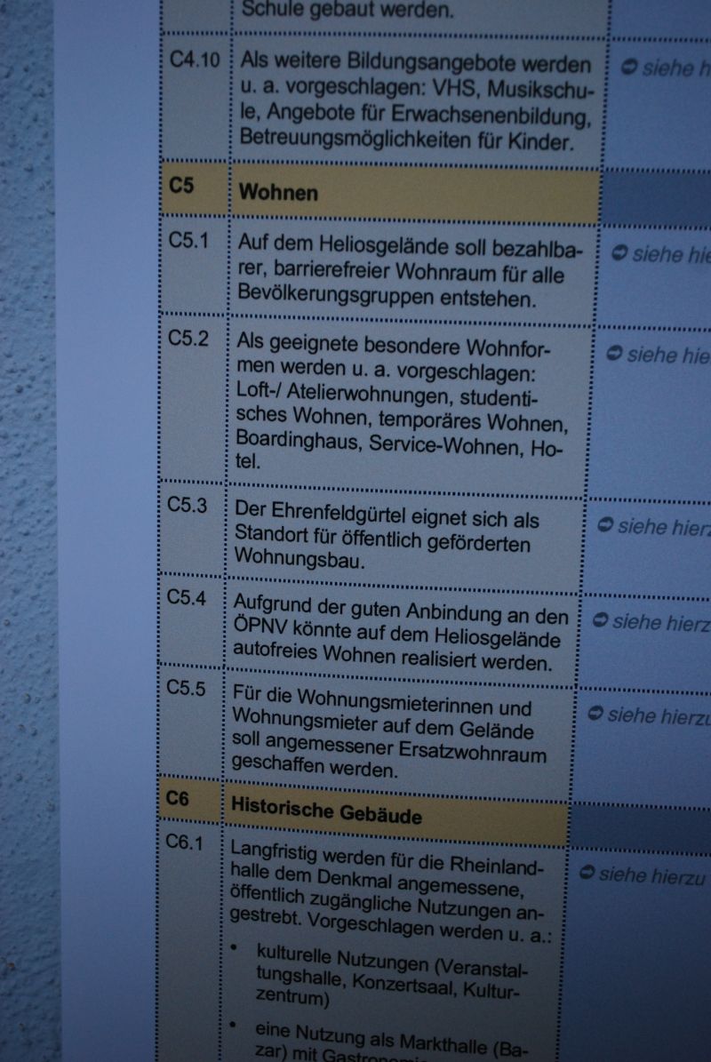 Hier wir der Mangel an Grünflächen in Ehrenfeld beklagt, das Gelände soll begrünt und nicht versiegelt werden und Fußläufig und für Radfahrer durchquerbar sein. Das Heliosgelände soll zum Verweilen einladen mit hoher Aufenthaltsqualität.