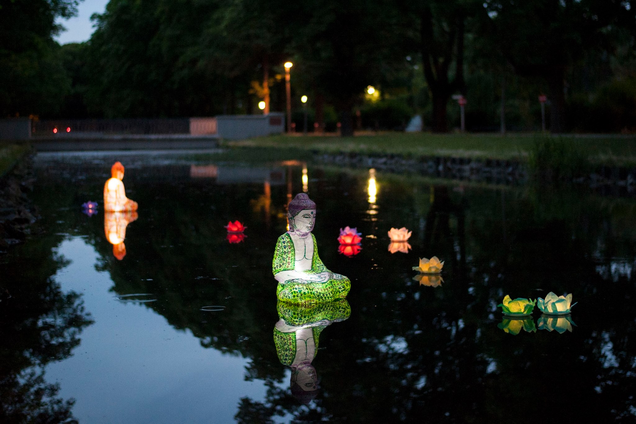 108 beleuchtete Buddhas, dürfen nicht auf dem Rautenstrauchkanal schwimmen, die Stadt Koeln verweigert die Genehmigung !