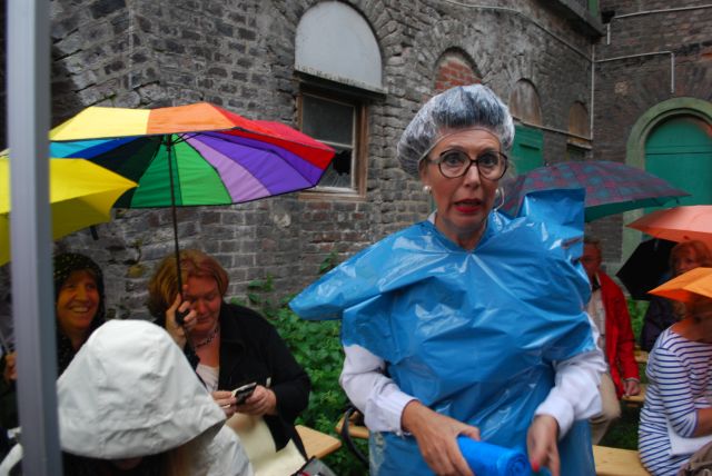 Biergartenfachangesellte Irmgard Knüppel, verteilte Mülltüten an „Bedürftige“, und passte dabei auf das es gerecht zuging, denn Mülltüte, Sitzplatz und Regenschirm, das wäre ungerecht, das wäre die Premiumedition.