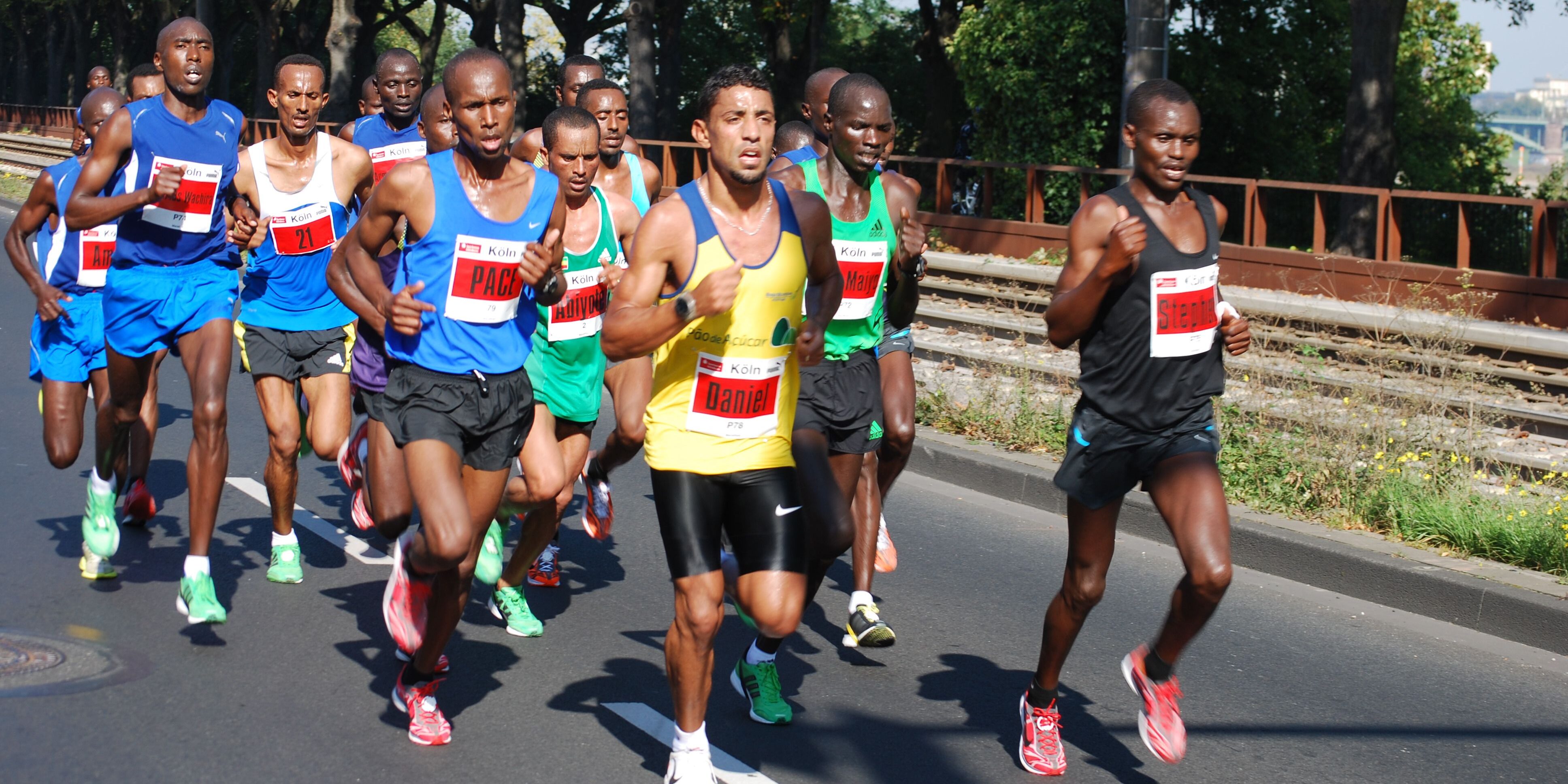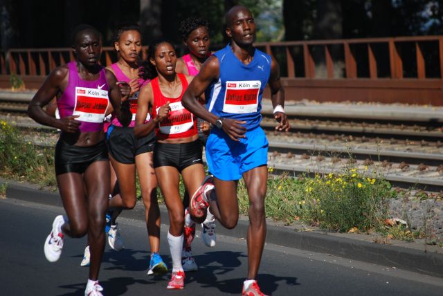 Die Spitzengruppe der Männer des Köln Marathons. Der Gewinner des 15. Köln Marathons, Samson Kiprono Barmao lief 02:08:53, links neben dem Läufer mit dem gelben Shirt