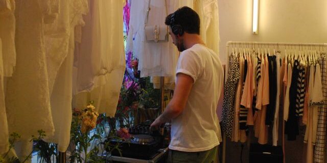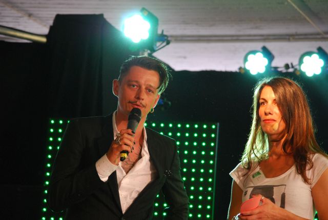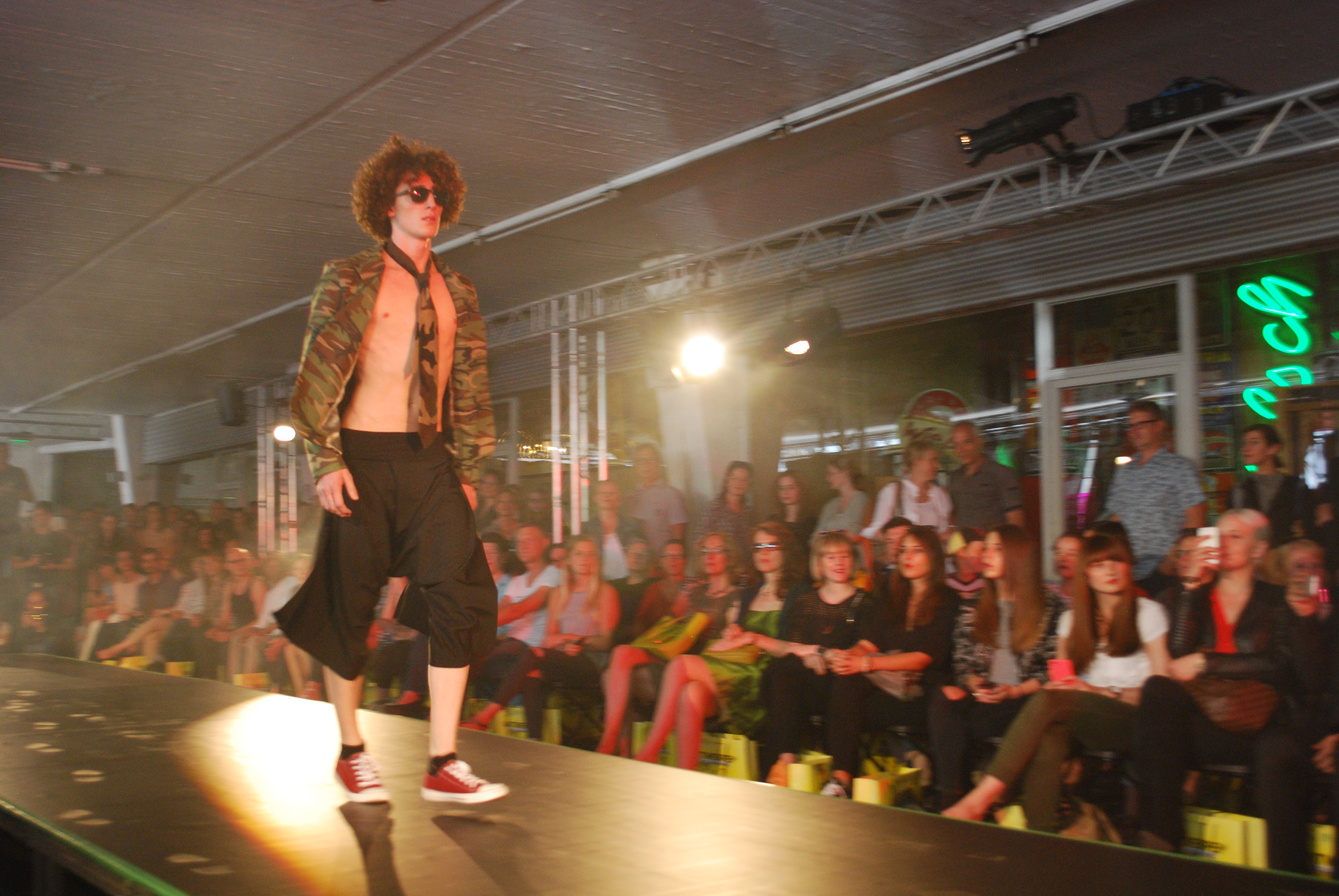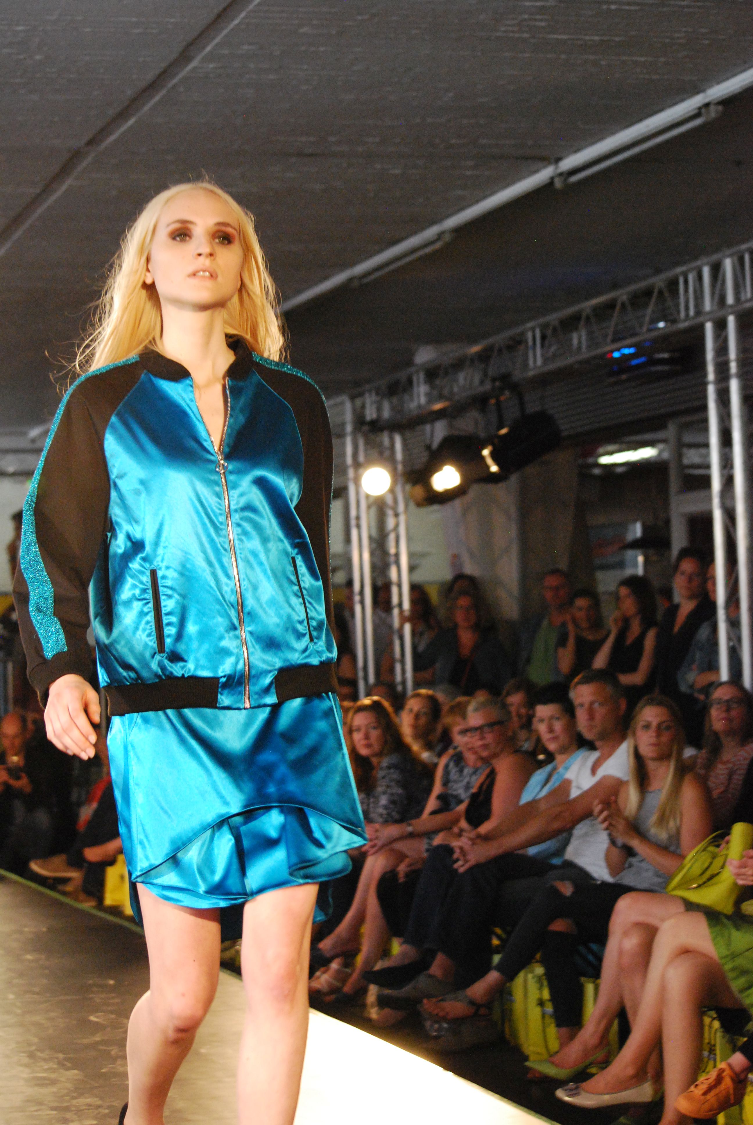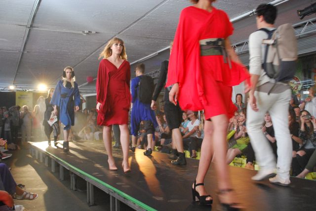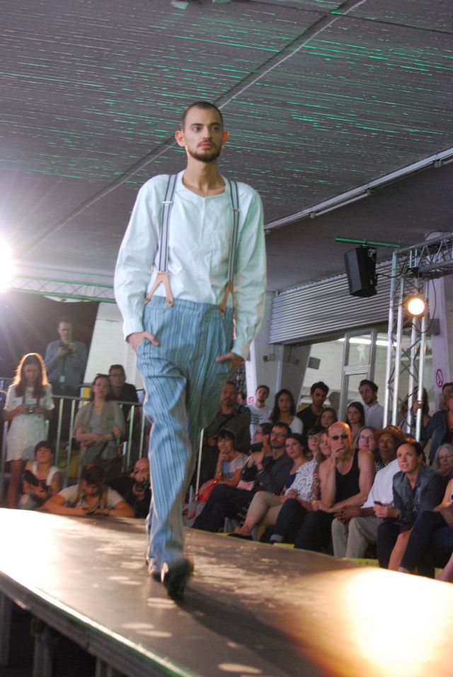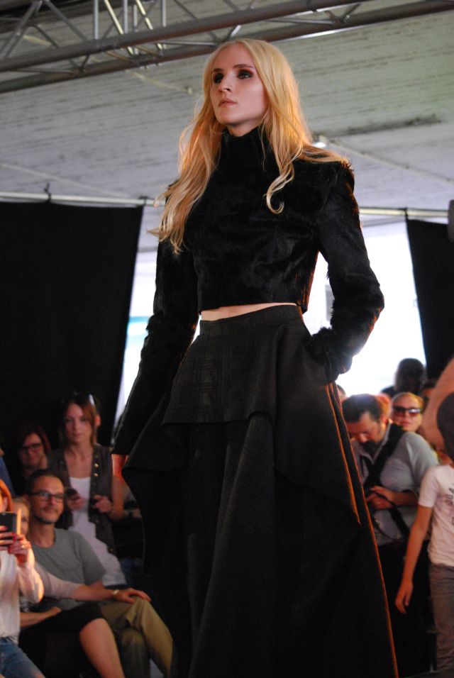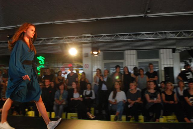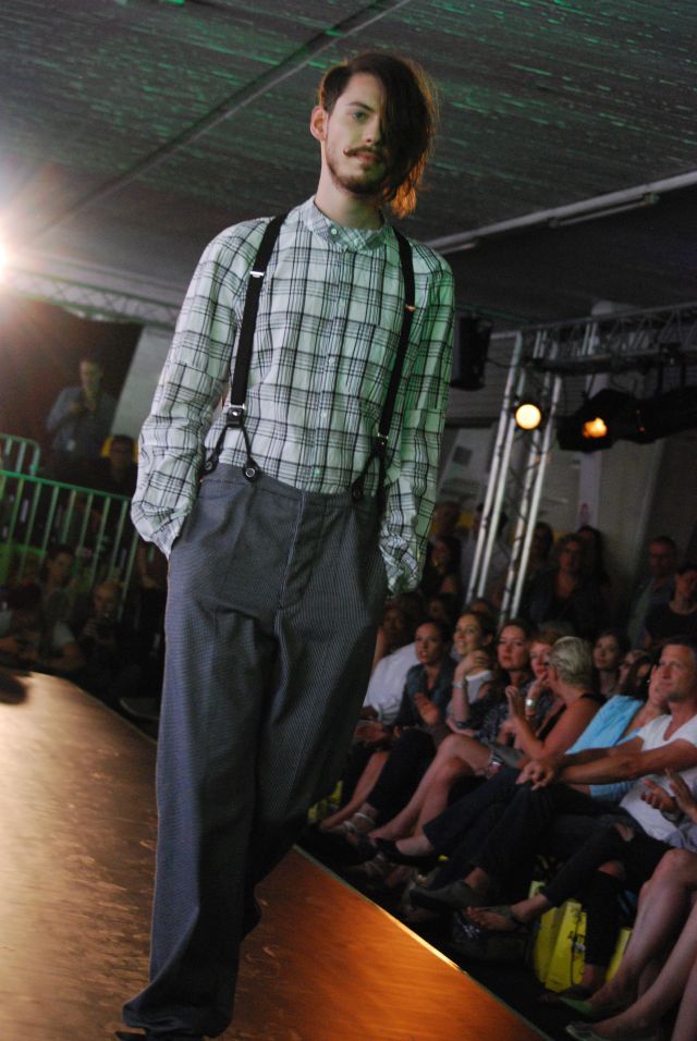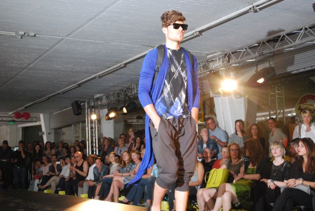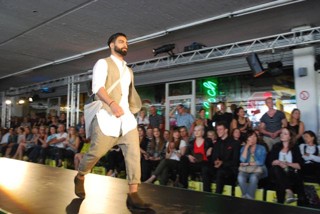und eleganten Mänteln, seine wandelbaren Kleider, aus fließenden Stoffen, die man auf verschiedene Arten tragen kann, so dass sich der Look verändert. Während seiner Modenschau gab es einen kleinen Stromausfall, der aber schnell behoben war und so konnte DJ Dirk Kels aka Fangkiebassbeton, schnell weiter unbeschwert auflegen