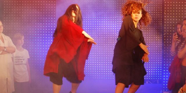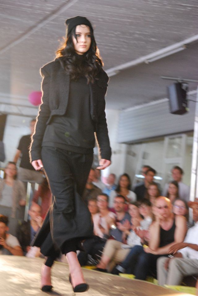 Joah Kraus kam mit Trippen, (Schuhdesign) und Katrin Gemünds (Design Department Düsseldorf) winterliche Mode, aus feinem, dunklen Tuch, kam durch das Objektiv, erst Mal gespenstig daher, bei näherer Betrachtung, erinnerte sie im Erscheinungsbild, an große Haute Couture.