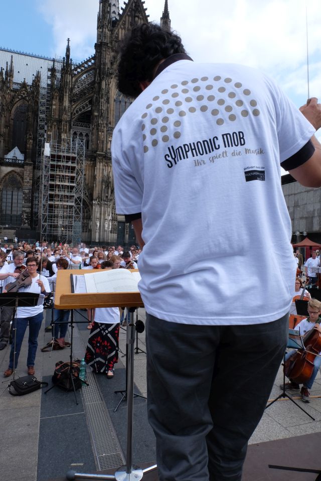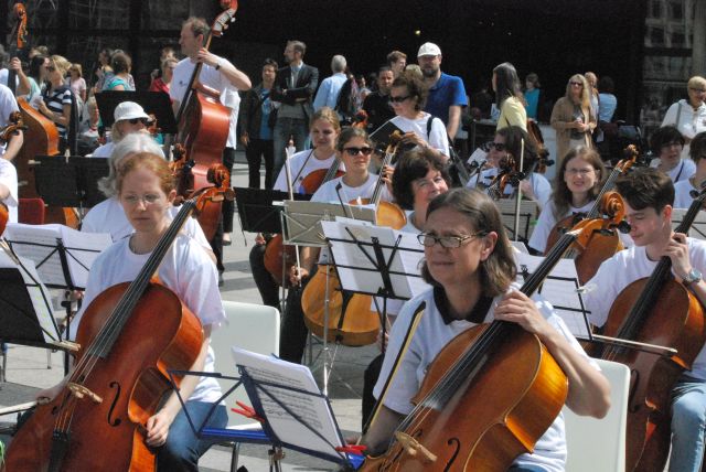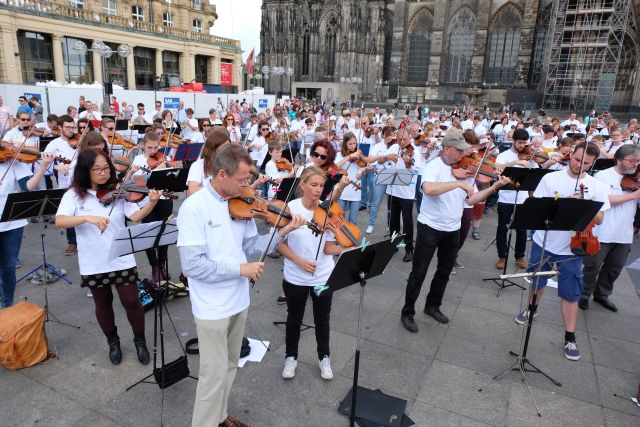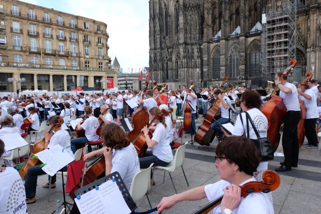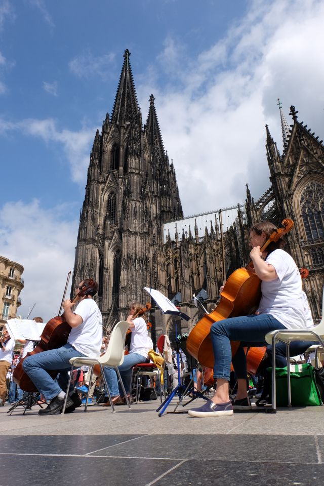 Jeder, der mochte und ein Open Air-taugliches Instrument hatte, konnte sich anmelden und zuhause schon mal üben. Die Gürzenich Musiker hatten Noten geschrieben, mit denen man sich hervorragend vorbereiten konnte. Je nachdem, wie gut man spielte, konnte man auch vereinfachte Stimmen spielen.