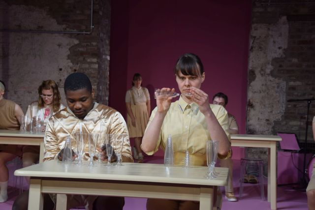 In einem Kellergewölbe werden kleine Plastik – Sektgläser zusammen gesteckt, was an sich schon ein Widerspruch ist. Das Leben findet im Gleichschritt statt. Die Abläufe sind eingeübt und monoton . Jeder weiß was zu tun ist. Keiner tritt aus der Reihe.