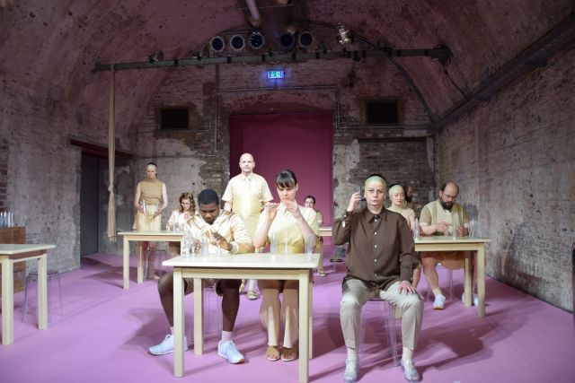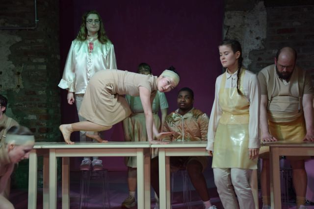 Zwischendurch, („am Feierabend“ )brechen sie aus, tanzen und haben Spaß, tanzen auf den Tischen, fast surreal. Als die Scheinwerfer auf das Publikum gerichtet werden, sitzen die Akteure in einer Reihe und sehen uns an, verkehren sich jetzt die Rollen und haben wir noch alles unter Kontrolle ?