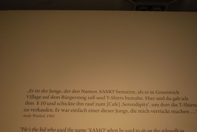 „Jean-Michel Basquiat wird am 22.2.1960 in New York geboren, der Vater stammt aus Haiti, die Mutter ist Puertoricanerin. 1978 beginnt Jean-Michel Basquiat seine künstlerische Karriere mit seinem Freund Al Diaz als Graffiti-Sprayer auf New Yorks Straßen, seine Graffitis signiert er mit „SAMO“, was für „Same old Shit“ steht. Für seinen Lebensunterhalt verkauft er bemalte Postkarten und T-Shirts, fertigt Assemblagen aus Schrott. Bald wird die New Yorker Kunstszene auf den jungen Künstler aufmerksam.“
