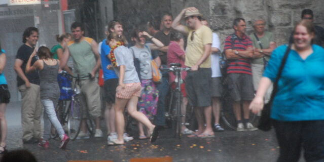 Die Plätze seien alle reserviert teilte mir meine Freundin mit, aber da diesen Fluten auf Dauer kein Sonnenschirm stand hielt, leerte sich der Platz allmählich. Die Wirte hatten jede Menge damit zu tun die Spielübertragung ,ins Innere der Lokale zu verlegen.