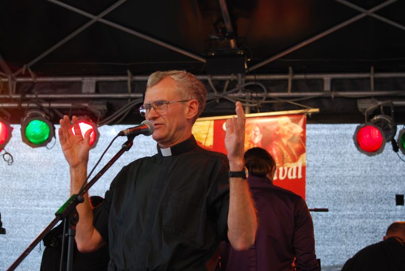 Pfarrer Meurer kam kurz vorbei geradelt, opferte seine Bananen zunächst für einen der Bühnenarbeiter, der diese dann an ein paar Findelkinder weiter reichte. In diesem Gewusel suchte eine Mutter ihren großen Sohn und die Mitarbeiter, die Eltern eines Zweijährigen. Pfarrer Meurer sprach noch schnell das „Wort zum Sonntag, über Dinge die das Leben verlängern und dazu gehört auch eine gute Nachbarschaft, ein guter Umgang zu seinen Nachbarn, damit rannte er bei den Anwesenden offene Türen ein. Dann setzte er seinen Helm auf und düste davon, very busy der Mann!