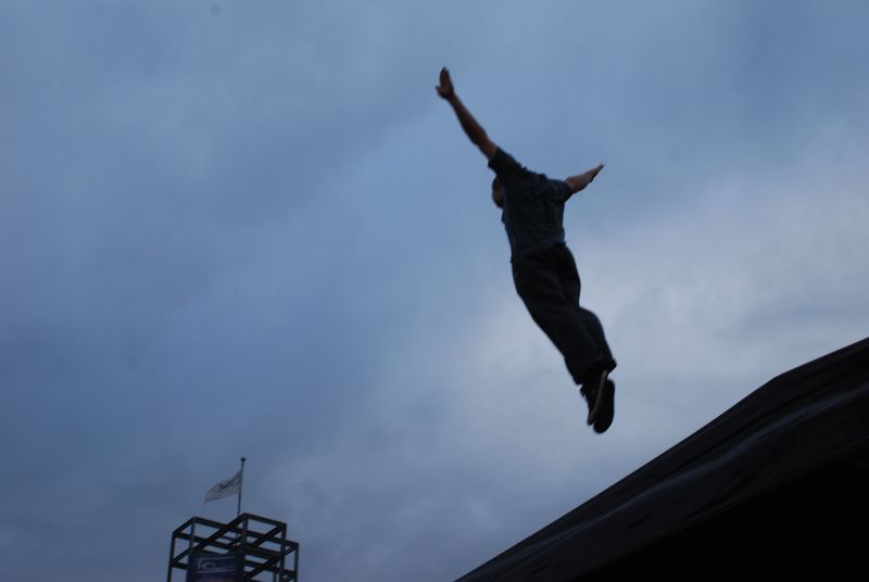 Nach ca. einer halben Stunde setzte der Regen ein, so das die Vorstellung abgebrochen werden musste, weil es für die Artisten nicht mehr möglich war, kontrolliert zu fallen.
