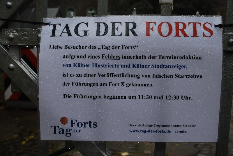 Ganz unter uns, das war ja heute ein saumäßiges Wetter, im Gegensatz zum gestrigen Tag. Doch es gibt ja bekanntlich kein schlechtes Wetter, sondern nur die falsche Kleidung. Heute rief also der „Tag der Forts“ und ich bin dann als erstes zum Kölner Festungsmuseum und das war dann auch das einzige Fort, das wirklich den ganzen Tag auf hatte. Für das leibliche Wohl war auch gesorgt und es gab Führungen.