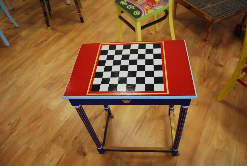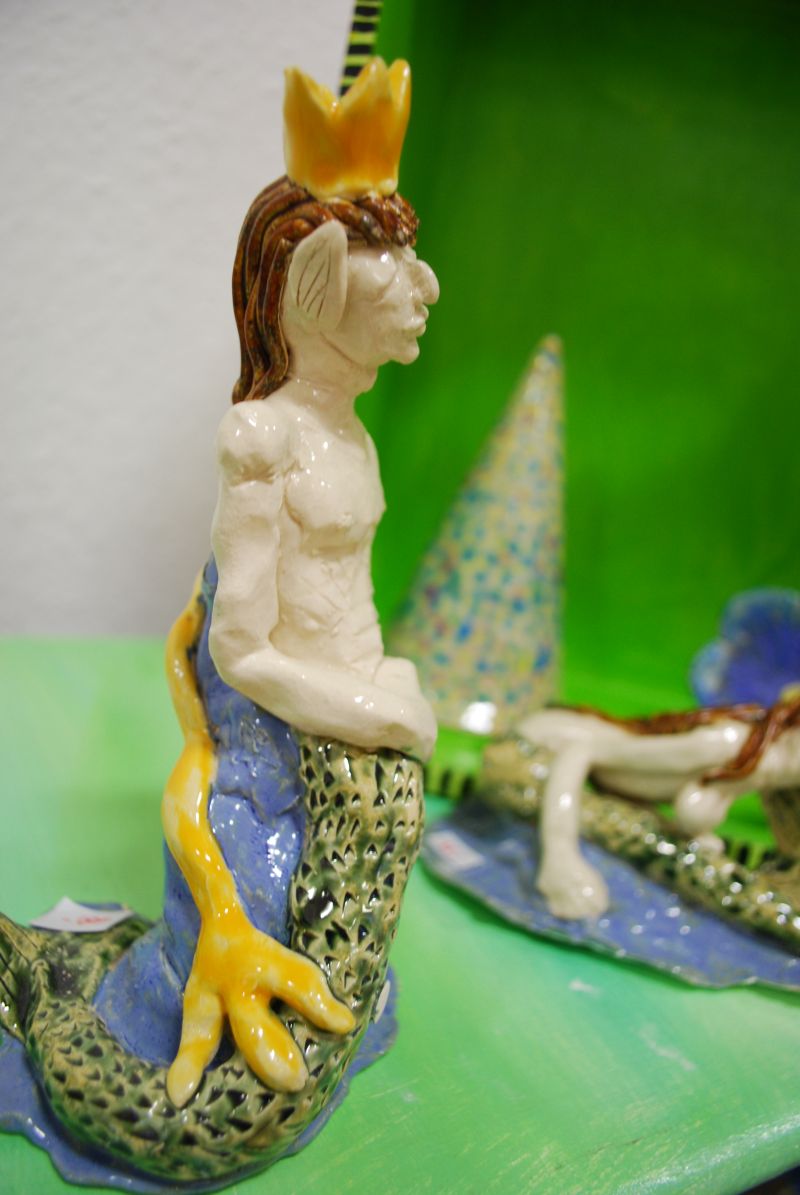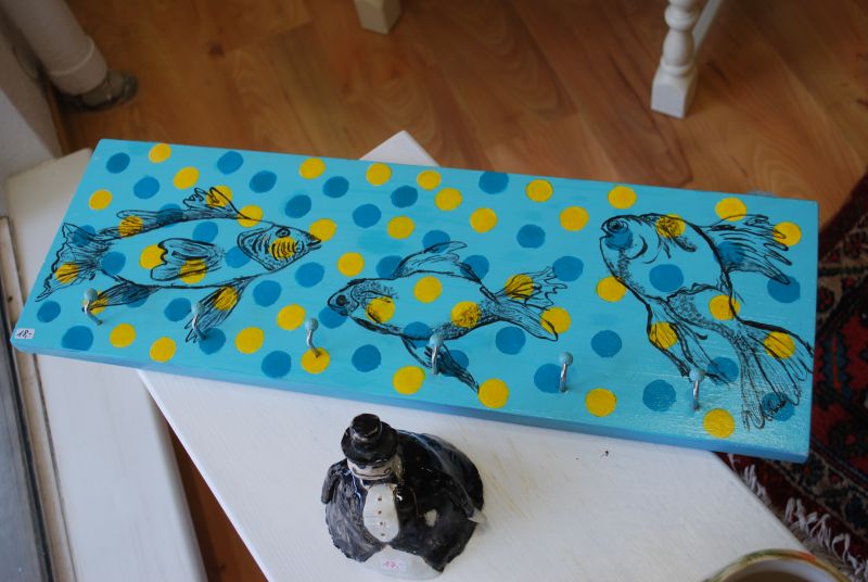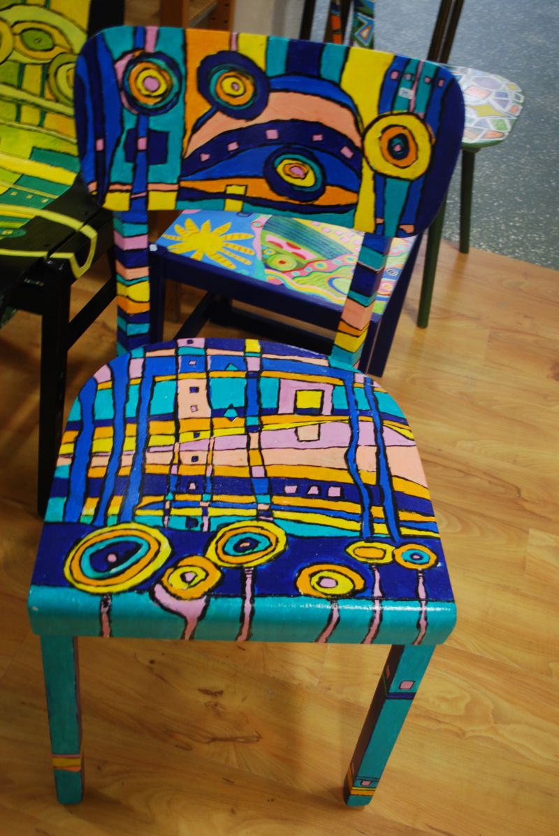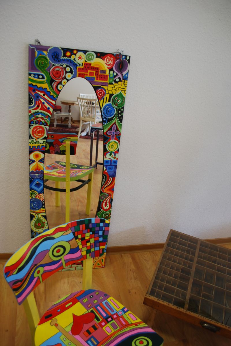 Es gibt allerlei aus Ton und bunt aufgehübschte Möbel- Gebrauchskunst, nennt das Frau Afken und jetzt kommt das eigentlich Besondere, die Pädagogische Werkstatt designt u.a. Stühle auf Auftrag passend zu den Gardinen, nach Motiven ihrer Wahl . Jeder ein Unikat!