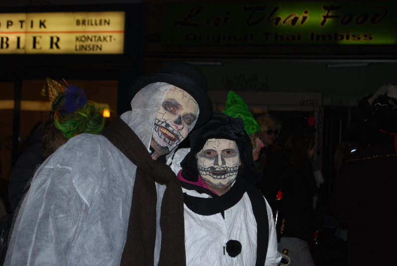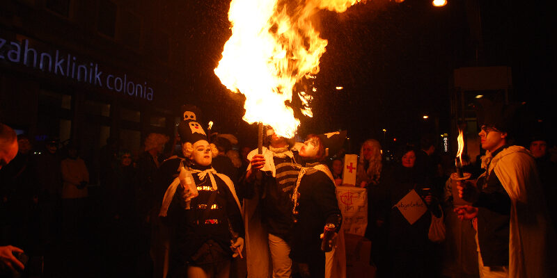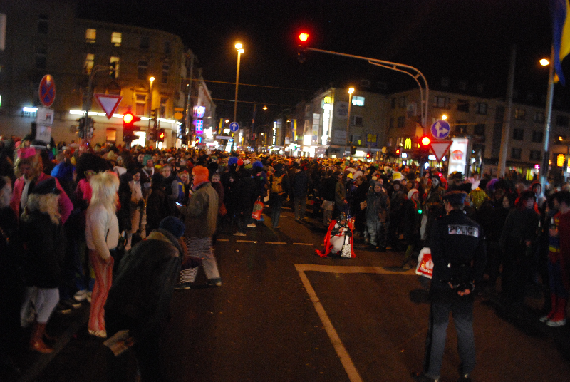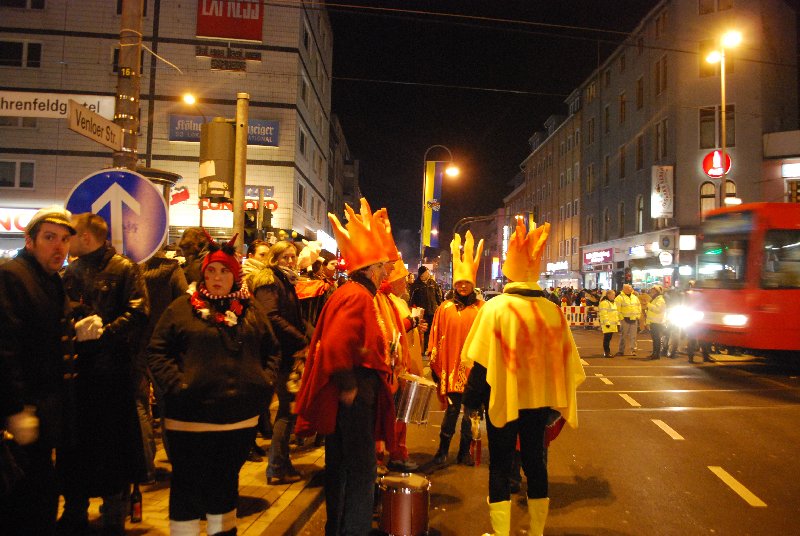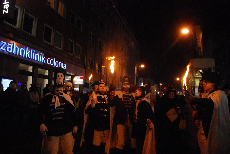 Es ist so als hätte sich ganz Ehrenfeld versammelt um die Wiedergeburt des Geisterzuges zu feiern. Es hatte ein längeres Tauziehen um die Genehmigung des Geisterzug gegeben, weil die Veranstalter Probleme hatten die strengen Sicherheitsauflagen zu erfüllen, fast wäre er wie auch schon im letzten Jahr ausgefallen. Wenn alle die ihn sich angeschaut haben bereit sind, auch nur einen Euro zu spenden, dann wäre seine Zukunft auch im nächstes Jahr gesichert.