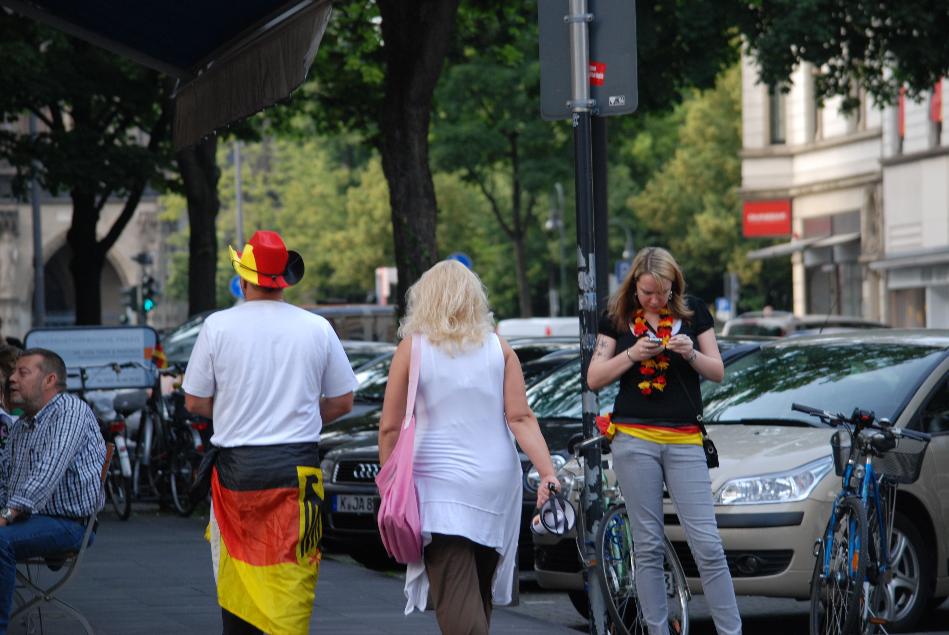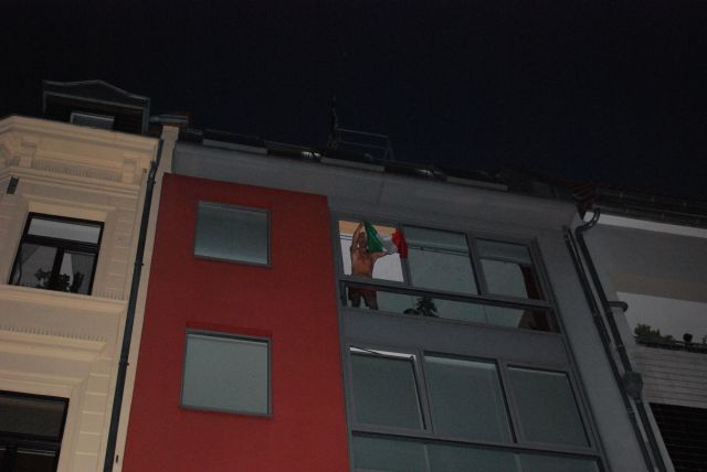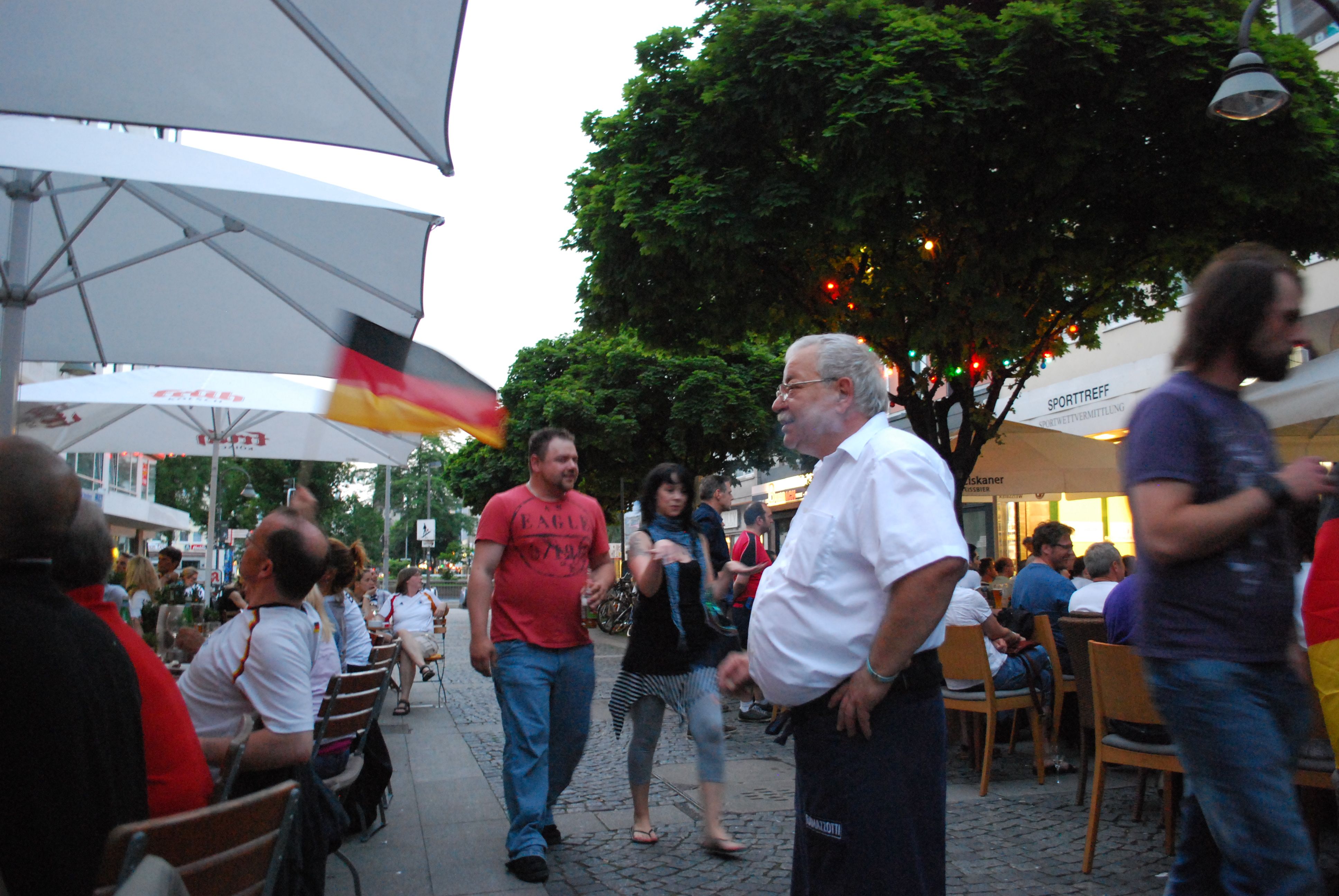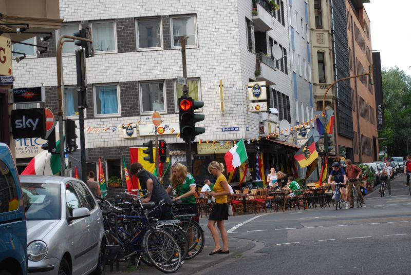 Am frühen Abend habe ich Tiramisu zum Rathenauplatz gebracht und bin dann quer durch die Stadt. Es war jede Menge los und es war schwül warm. Dann habe ich im Agnes Viertel einen Kaffee getrunken, dort gab es eine eher bescheidene Fanmeile…….
