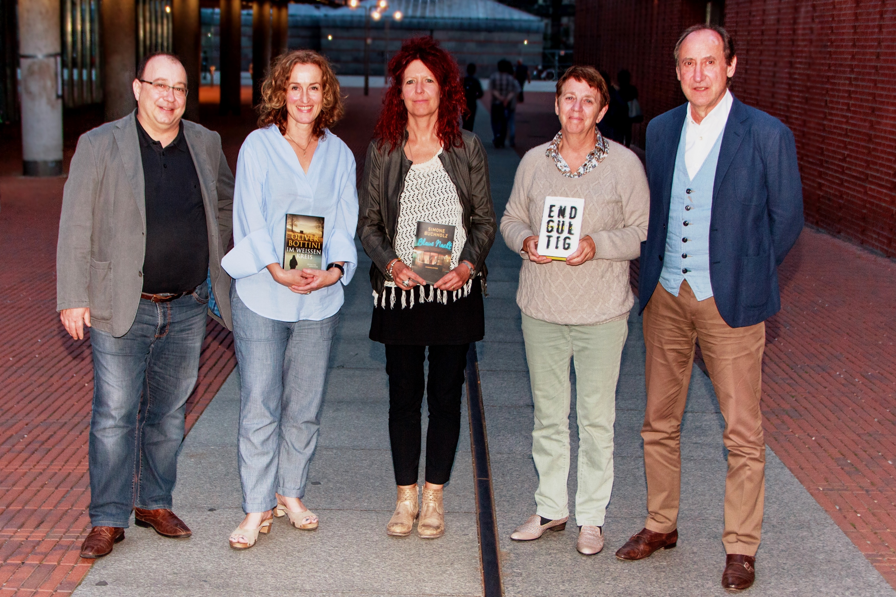 Die Jury mit der Shortlist zum Crime Cologne Award, bestehend aus Orkun Ertener, Antje Deistler, Gisa Klönne, Margarete von Schwarzkopf und Klaus Bittner – Bild Crime Cologne